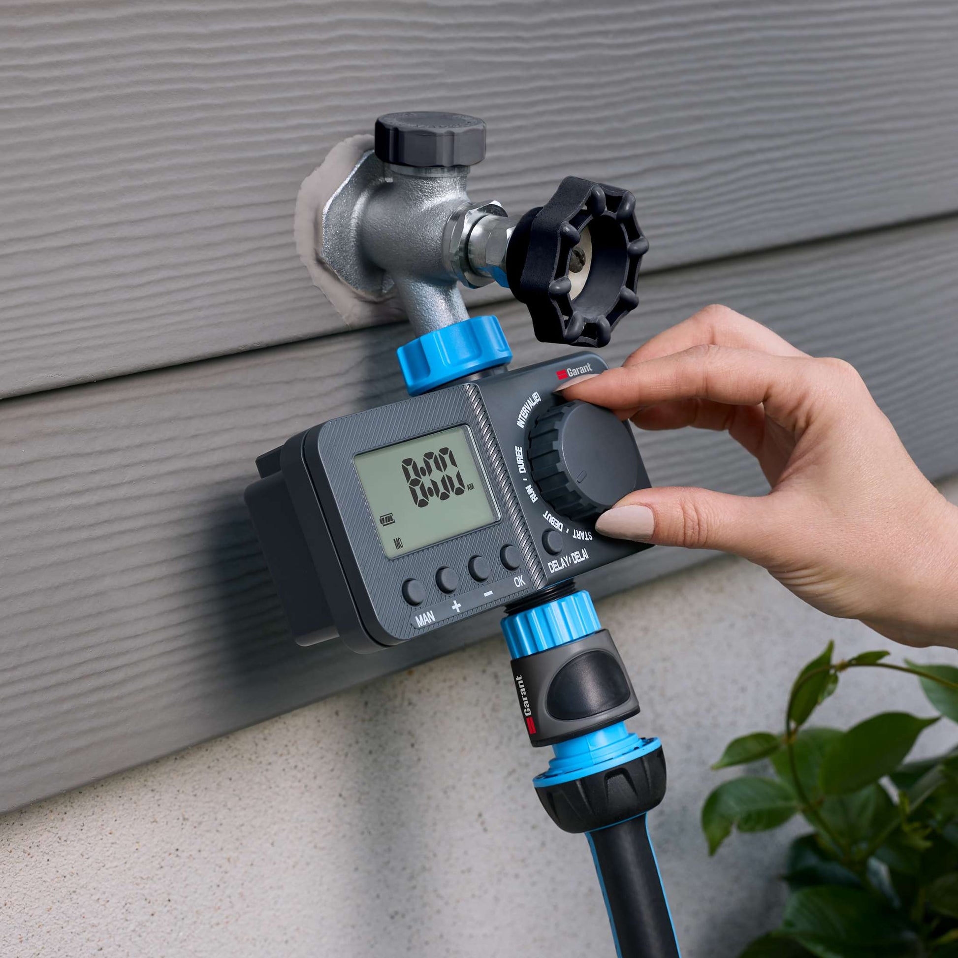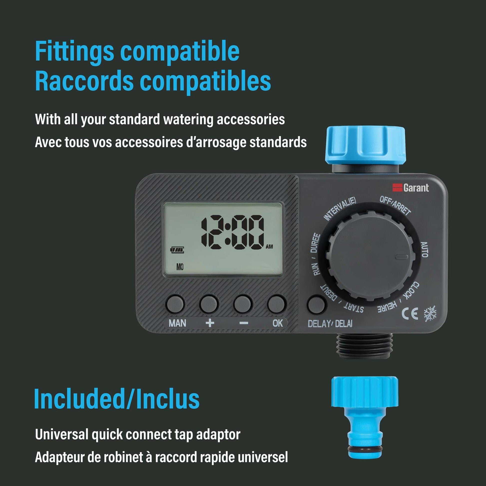 Son écran ACL extra large et son cadran de sélection pratique rendent la programmation intuitive : réglez en toute simplicité la durée et la fréquence de vos arrosages. Cette minuterie est compatible avec tous les accessoires d’arrosage standards et inclut un adapteur de robinet à raccord rapide universel. Compacte et efficace, elle vous aide à gagner du temps, préserver l’eau et garder vos espaces verts en santé.