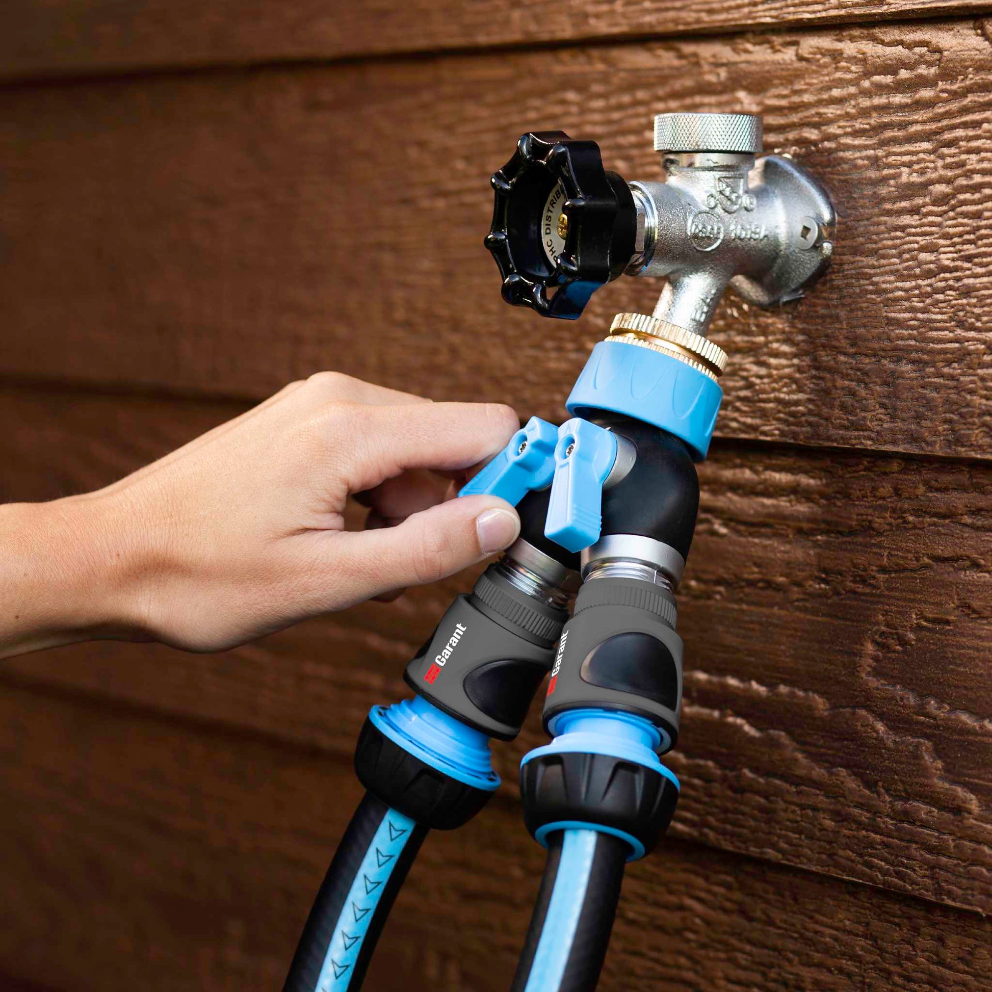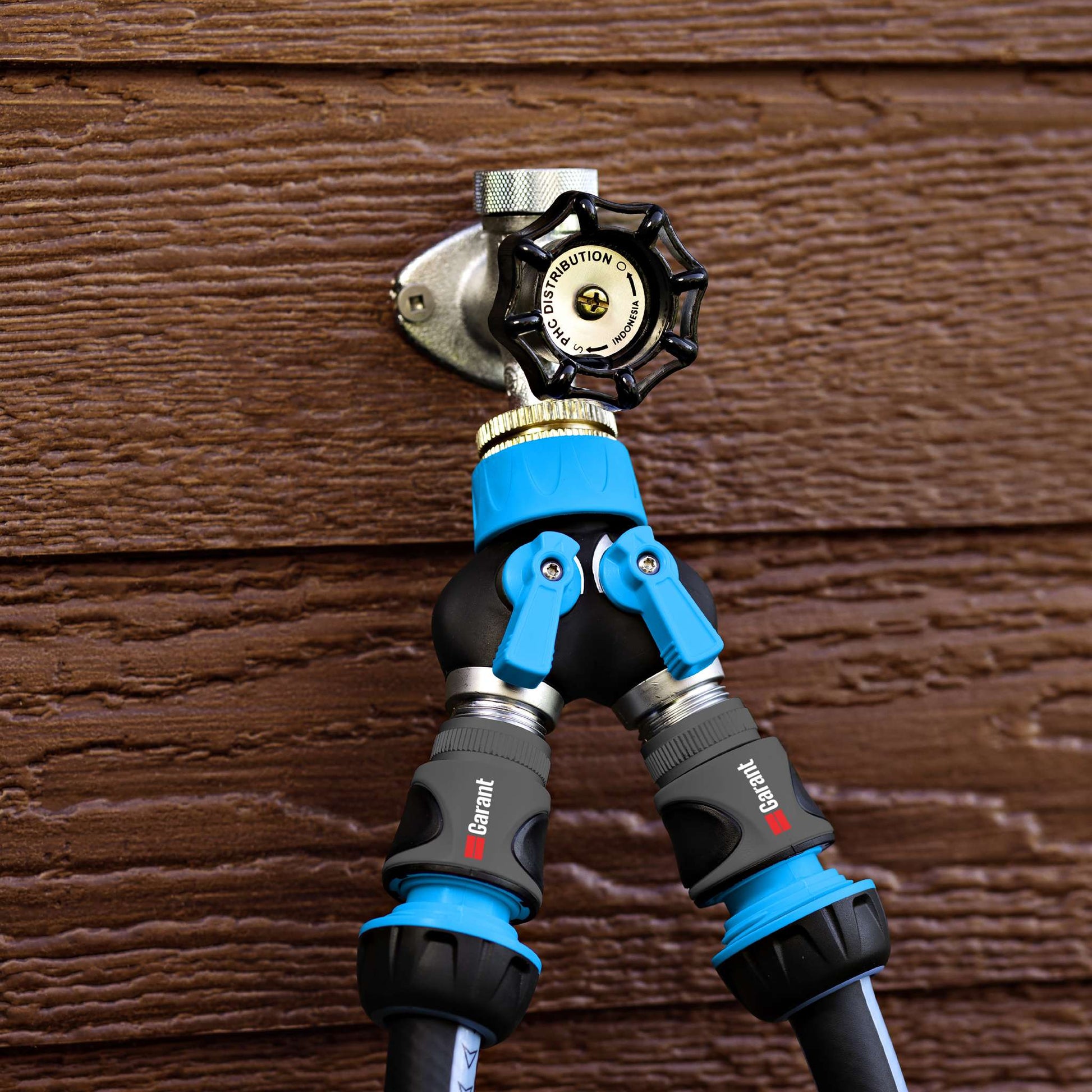 The Garant Twin Tap Connector allows you to connect two hoses to a single tap. Ideal if you want to operate two watering accessories at the same time without having to switch hoses at the tap. You can control the water outlets independently of each other. Screw it onto your tap to easily and quickly click on your garden hoses, thanks to the quick connect system. The Twin Tap Connector connects to all the Garant hose connectors or any other quick connect accessory.