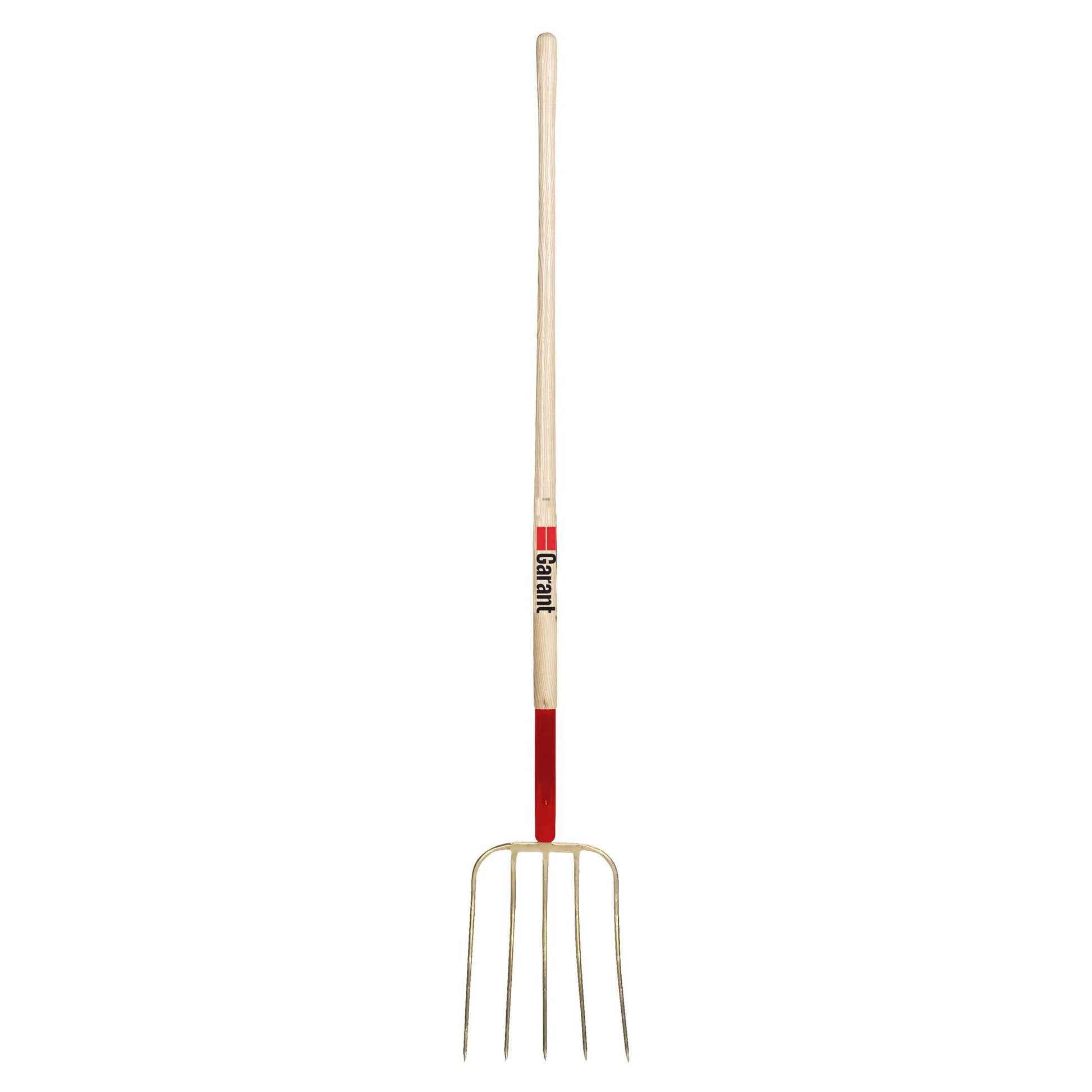 Lift, move and mix fertilizer, manure or compost with the help of the Garant manure fork. This tool is equipped with an ultra-robust head made of a single piece of forged and tempered steel. Its 5, 13\" (33 cm) tines are sharp and narrow for better manipulation of the manure. This manure fork is designed especially for farmers looking for a robust, efficient and comfortable tool.