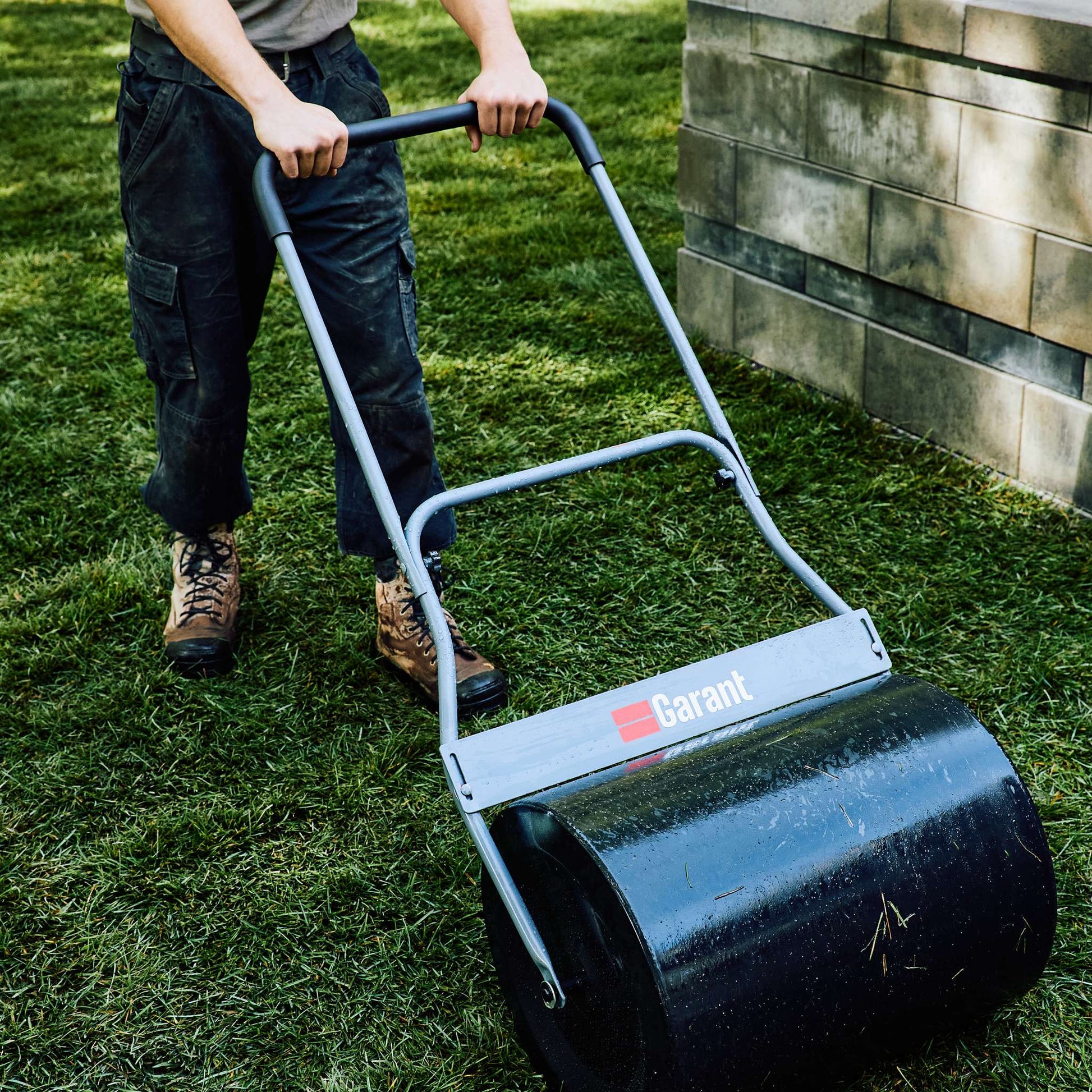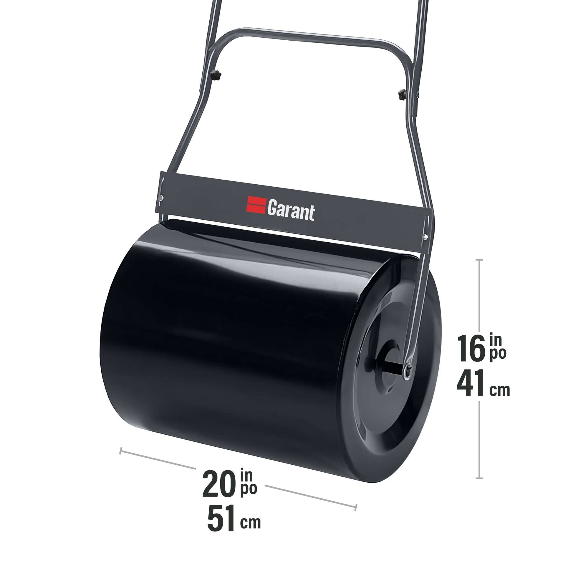 Achieve a smooth and even lawn with the Garant 16" x 20" lawn roller, designed for residential use. Its durable steel drum can be filled with water or sand to reach up to 155 lb of pressure, allowing efficient soil compaction and helping eliminate bumps and uneven areas. Ideal for preparing the ground before seeding or laying sod, it improves seed to soil contact for better growth results. Its compact size makes it easy to maneuver in tighter spaces. The retractable handle allows convenient storage, while the cushioned grip enhances comfort during use. An essential tool for maintaining and leveling your lawn efficiently.