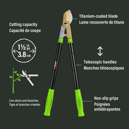 • Telescopic looping shears : 37.5” (95 cm) reach with extendable handles and rotating mechanism for easy access to high branches.