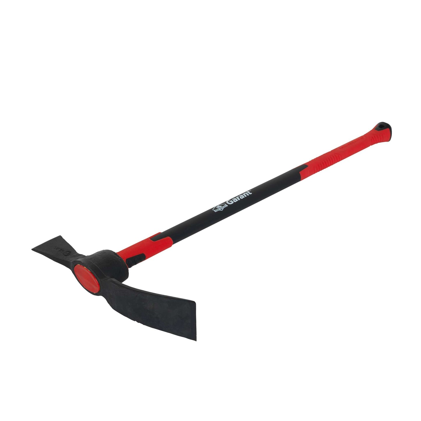 Industrial-grade cutter and mattock, 5 lbs forged steel head with 35 in fibreglass industrial resin injected handle and non-slip soft grip. Mechanical safety assembly. Ideal for breaking and smoothing hard ground, or for removing rocks and roots. Designed for demanding jobs.