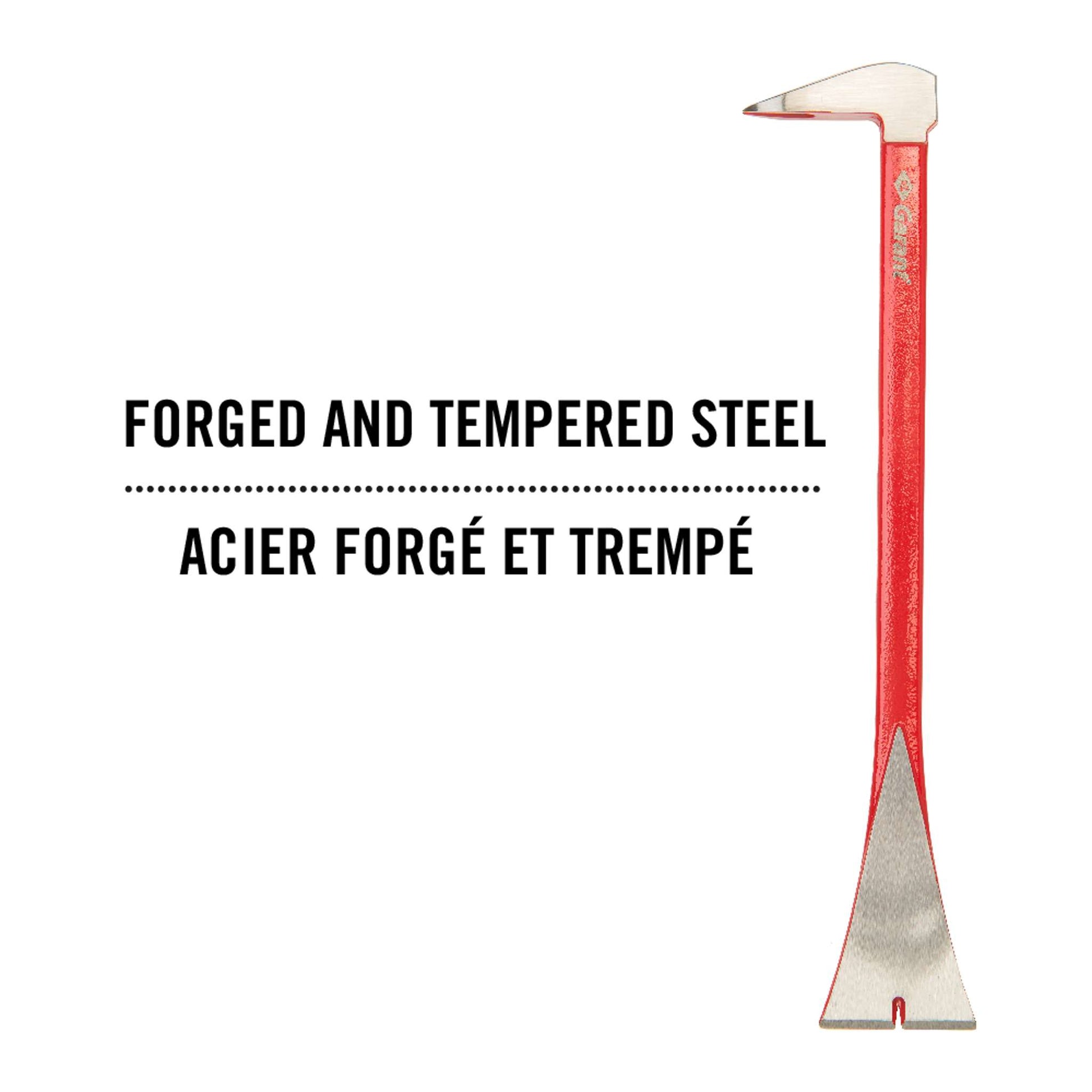 Remove moldings, base boards and small nails quickly and with precision with the help of the Garant molding bar. This 12 inch (30.5 cm) tool is made forged and tempered steel for increased strength and rigidity. The work surface is polished with a beveled extremity in order to avoid damaging materials. The head has a small striking surface to get under anchored, broken or headless nails. The flat inferior extremity with the integrated nail puller allows for the removal of molding, base boards and small nails with precision. This molding bar is especially made for DIYers and professionals looking for a robust, reliable and efficient tool for various construction projects.