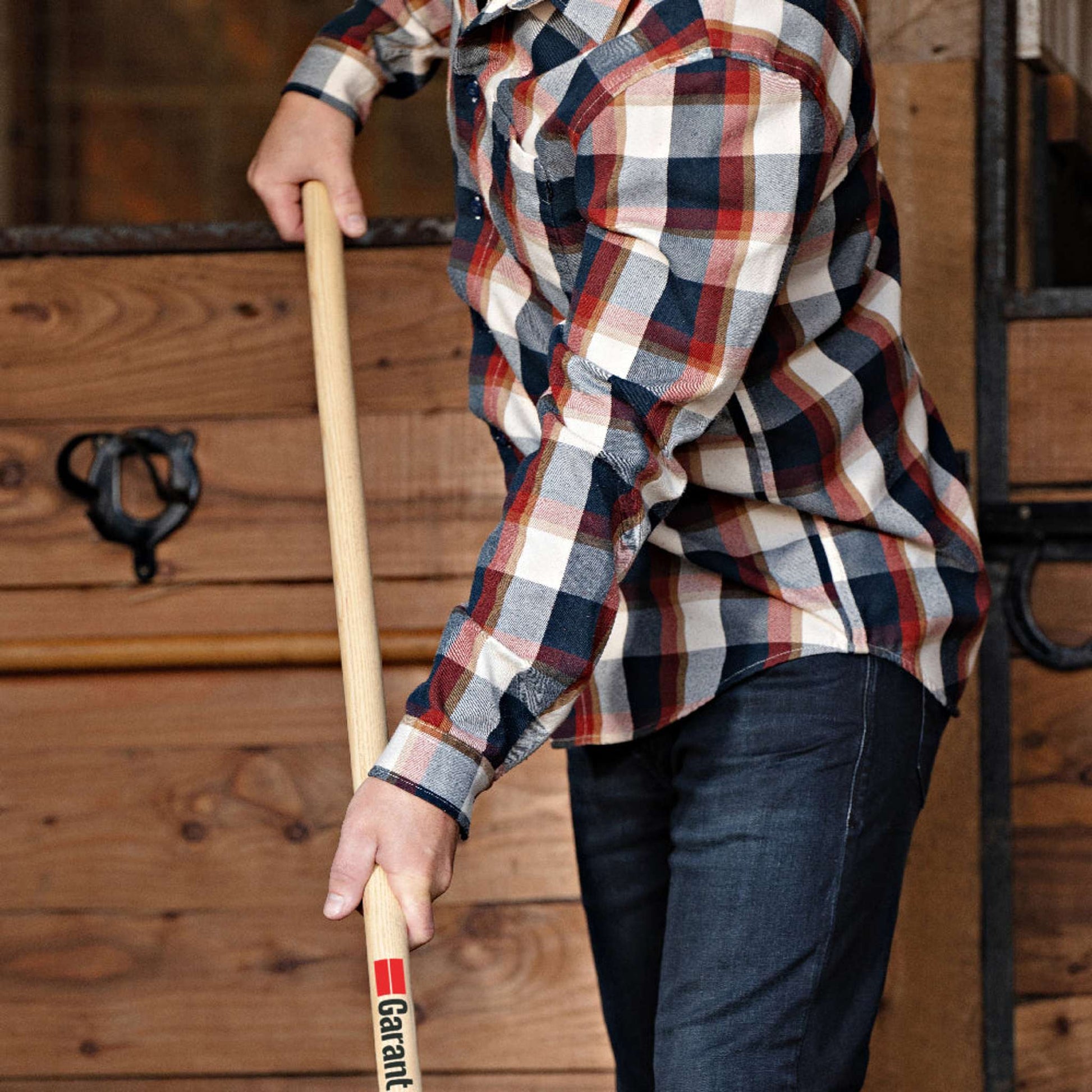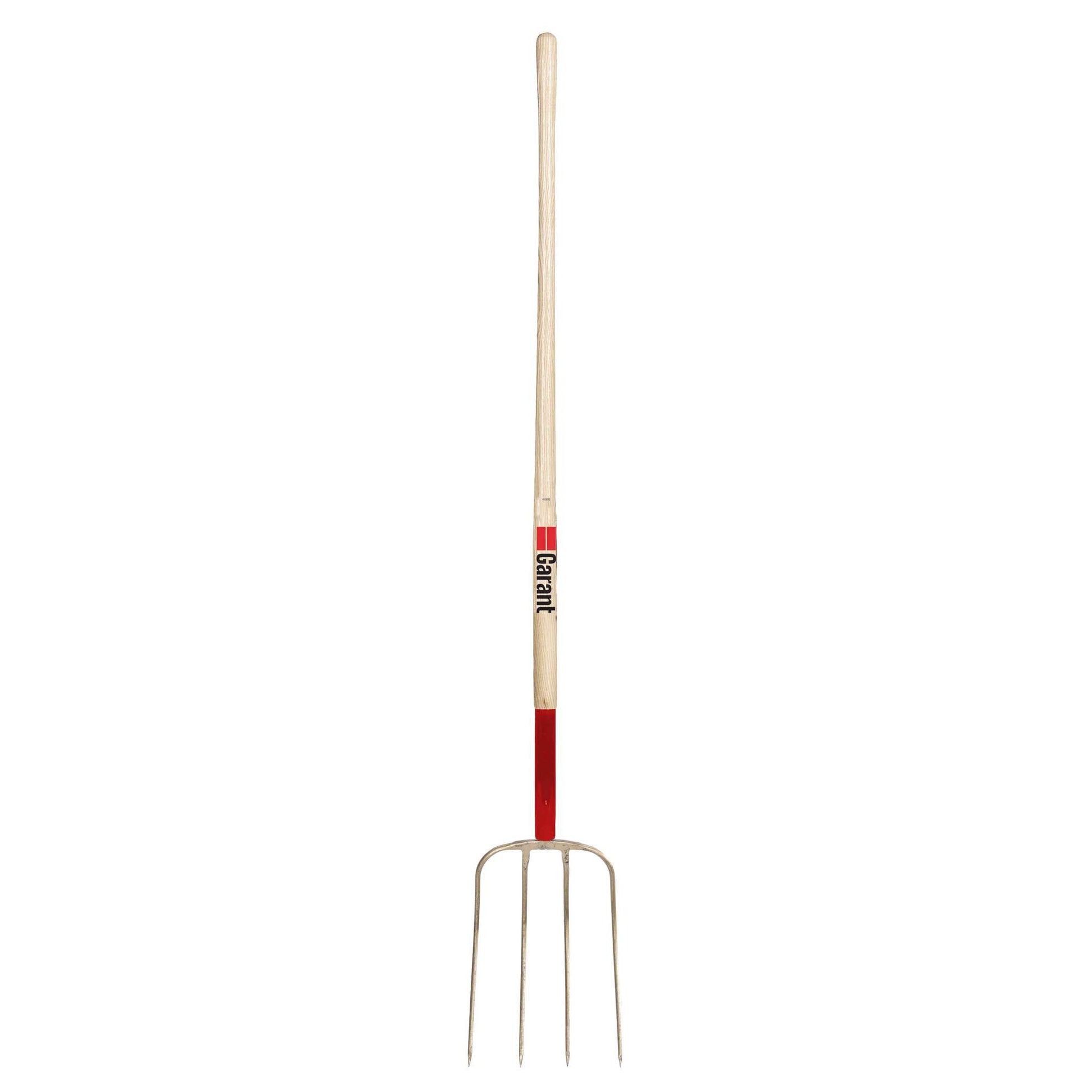 Lift, move and mix fertilizer, manure or compost with the help of the Garant manure fork. This tool is equipped with an ultra-robust head made of a single piece of forged and tempered steel. Its 4, 13\" (33 cm) tines are sharp and narrow for better manipulation of the manure. This manure fork is designed especially for farmers looking for a robust, efficient and comfortable tool.