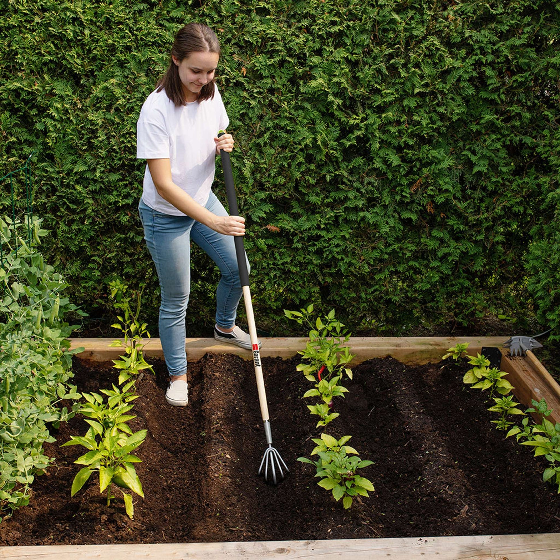 Uproot weeds, loosen and aerate the soil with the Garant cultivator. Great for eliminating weeds and working the soil.