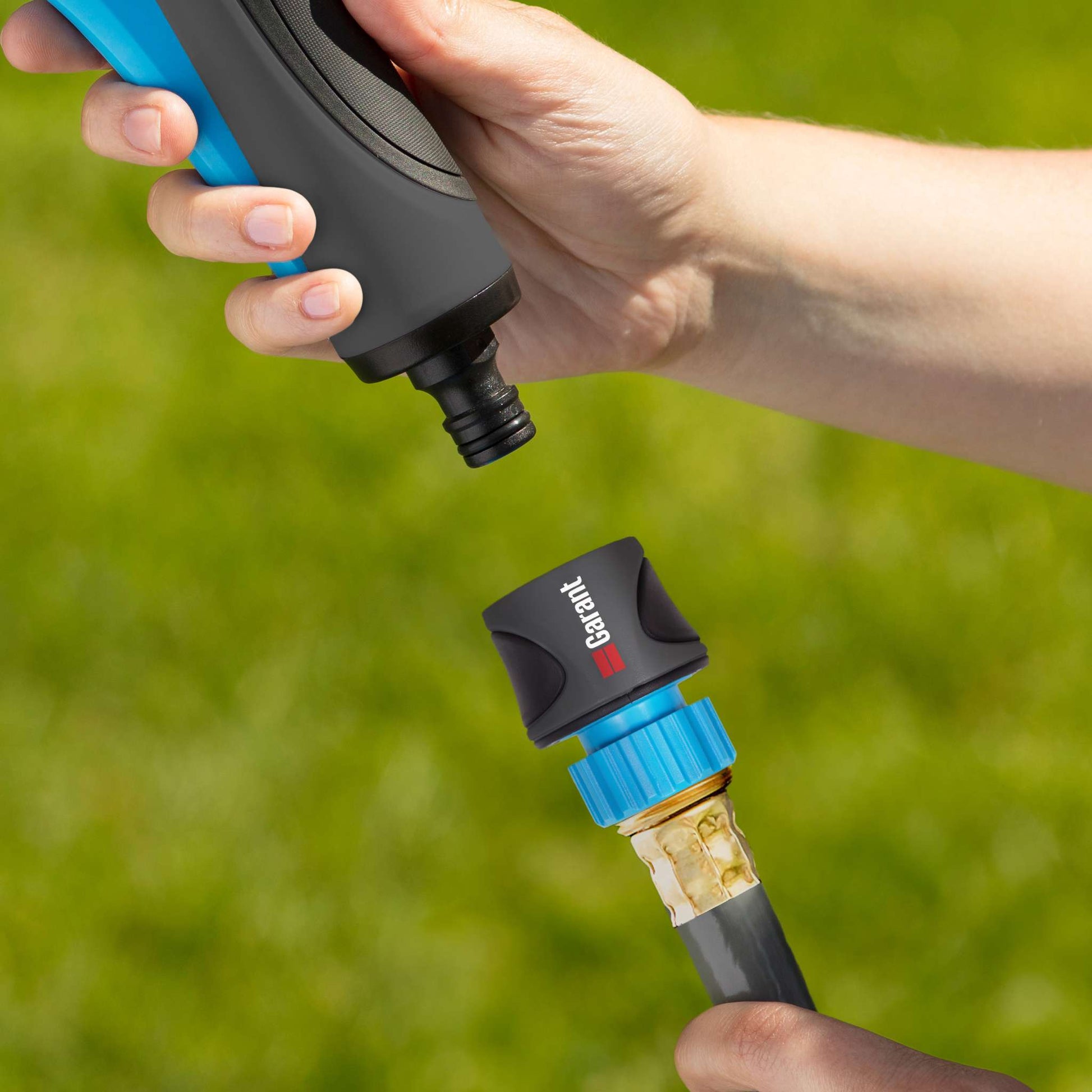The Garant Female Hose Connector with Waterstop screws directly onto the brass fittings of a standard garden hose, instantly turning standard hose brass fittings into quick connect fittings. With the Waterstop, it is perfect for the accessory end since it allows you to change accessories without turning off the tap. Once the connector is screwed onto the brass fitting, you can easily and quickly click it to your Garant accessories or any other quick connect accessory.