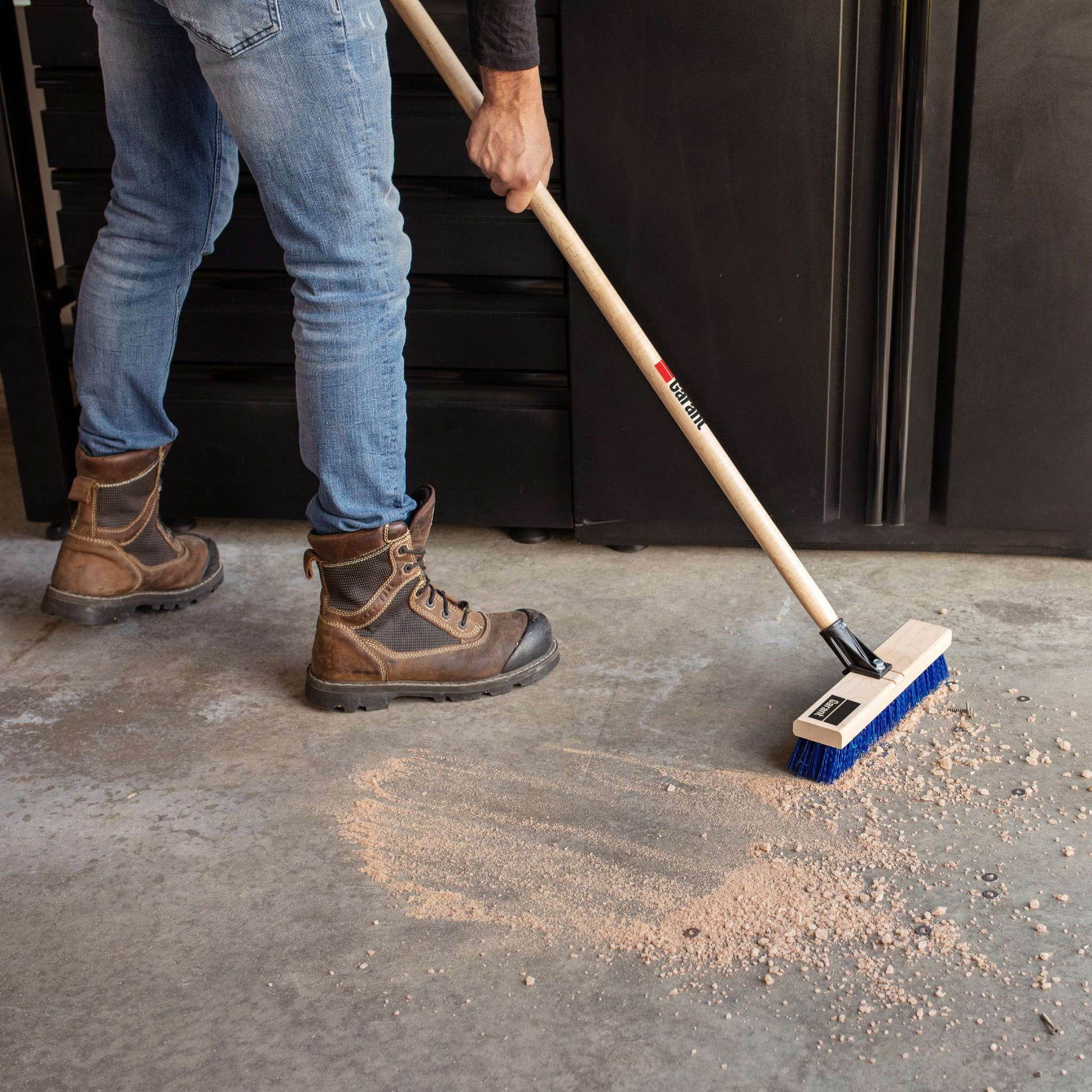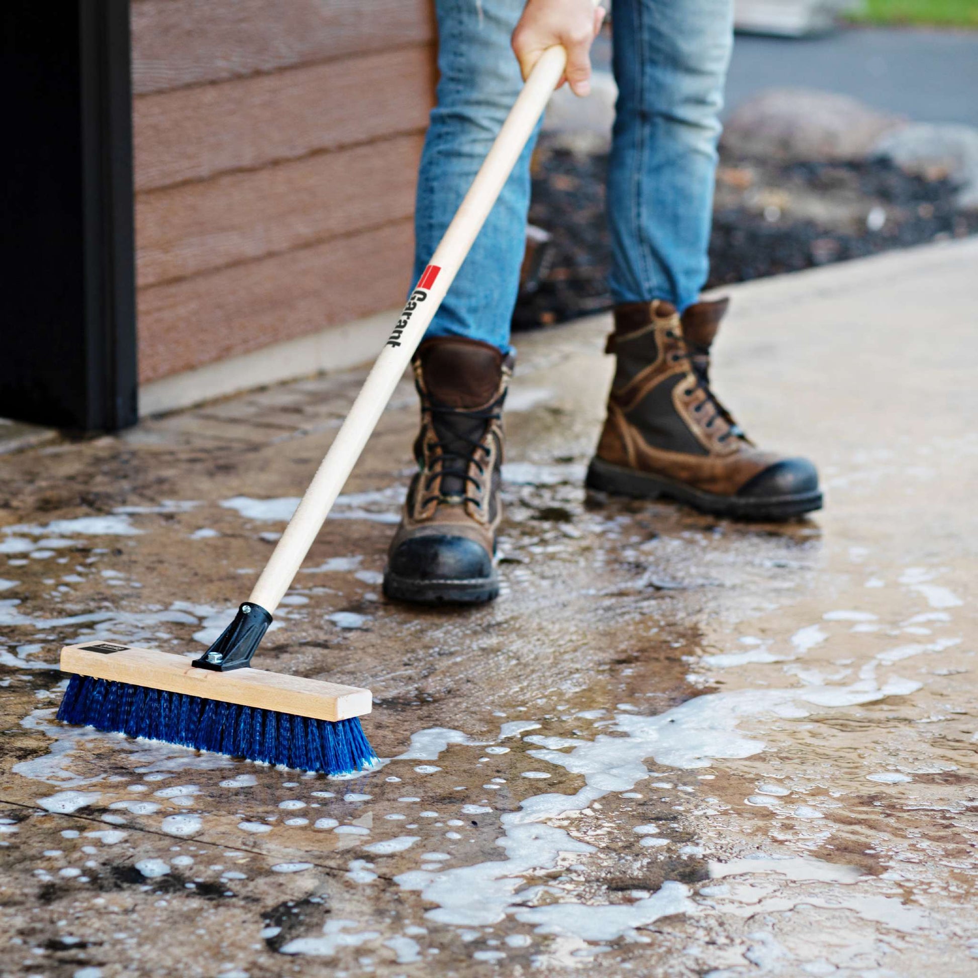 12 inches Contractor - all-purpose deck brush, stiff scrubbing 2 inches synthetic bristles for deep cleaning of dirt, mud, sludge, and grease, 1-1/8 in. x 60 in. wood handle with bolt-on connector, use outdoors on all surfaces in wet or dry conditions.