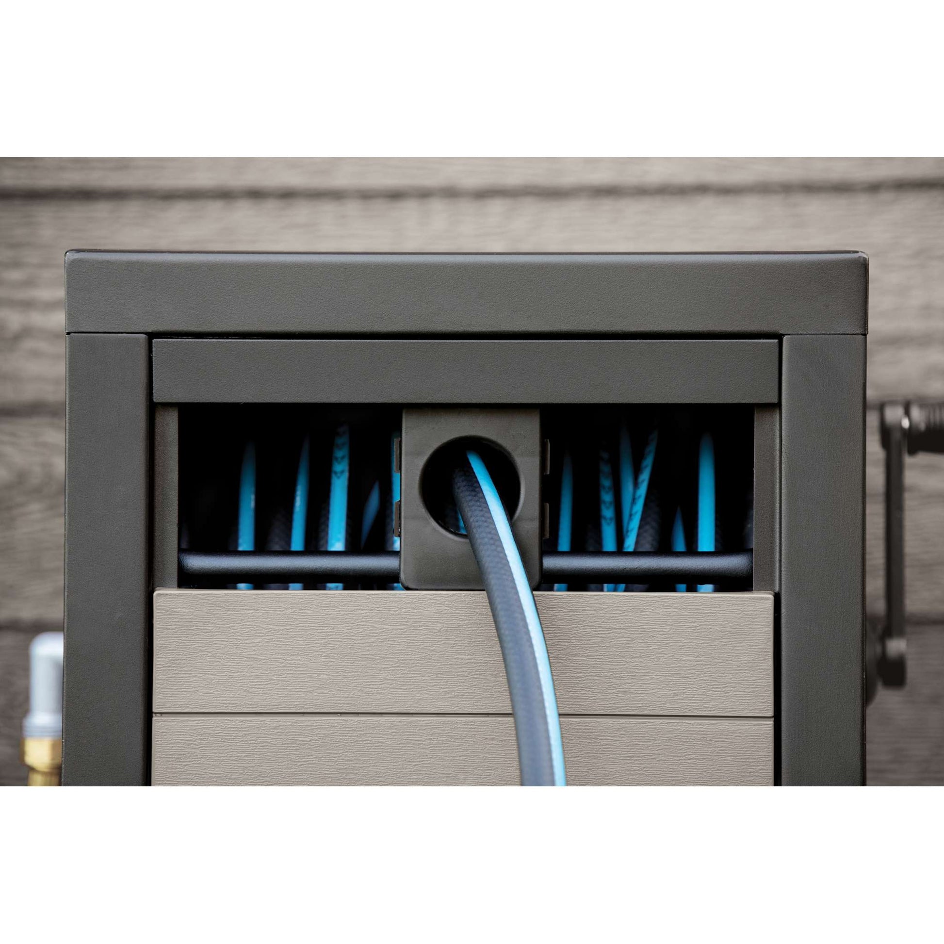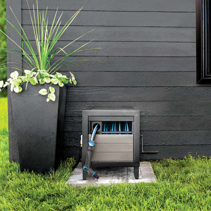 Garant's Hose Reel Cabinet can wind up to 30 meters (100 feet) of hose. Both good-looking and useful, it is built on a sturdy metal frame for maximum stability and durability. Its durable greige plastic side panels feature a wood-grain finish designed to blend elegantly with your outdoor décor. The Auto-Tack hose-guide system ensures seamless winding, while its aluminum NeverLeak system prevents leaks. This attractive reel cabinet requires minimal assembly. Garant makes watering easy!