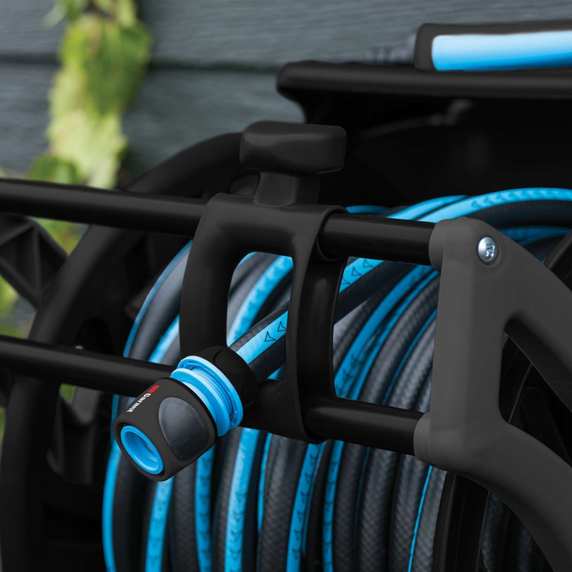 The Garant Deluxe Wall-Mount Hose Reel holds up to 225 ft of 5/8-in hose. Its impact resistant poly construction is sturdy and durable, in addition to being leak-proof, thanks to the NeverLeak" aluminum water system. It has a handy storage tray for accessories and a hose guide for winding without kinks and twists. 4-ft leader hose included.