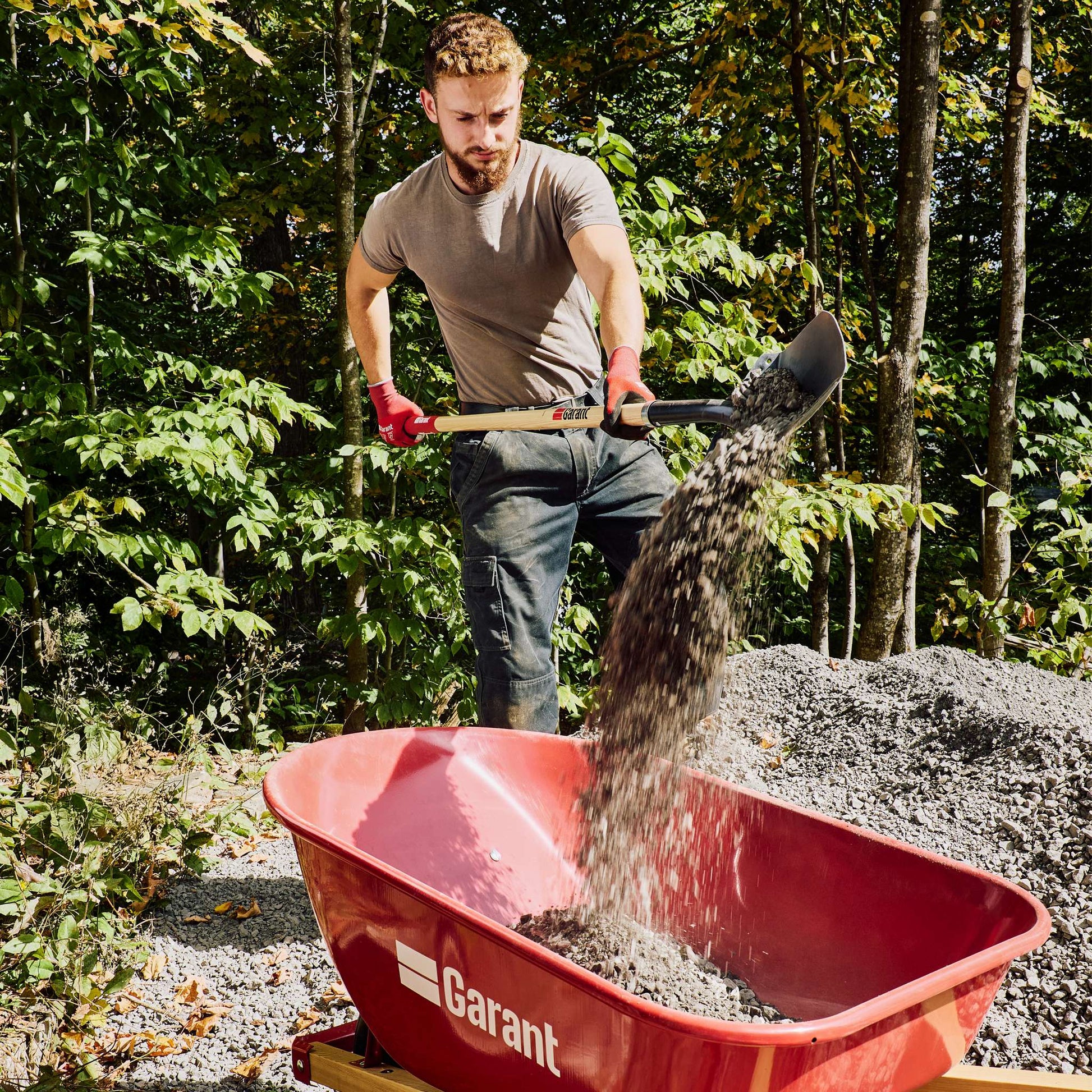 Round point shovel, long wood handle