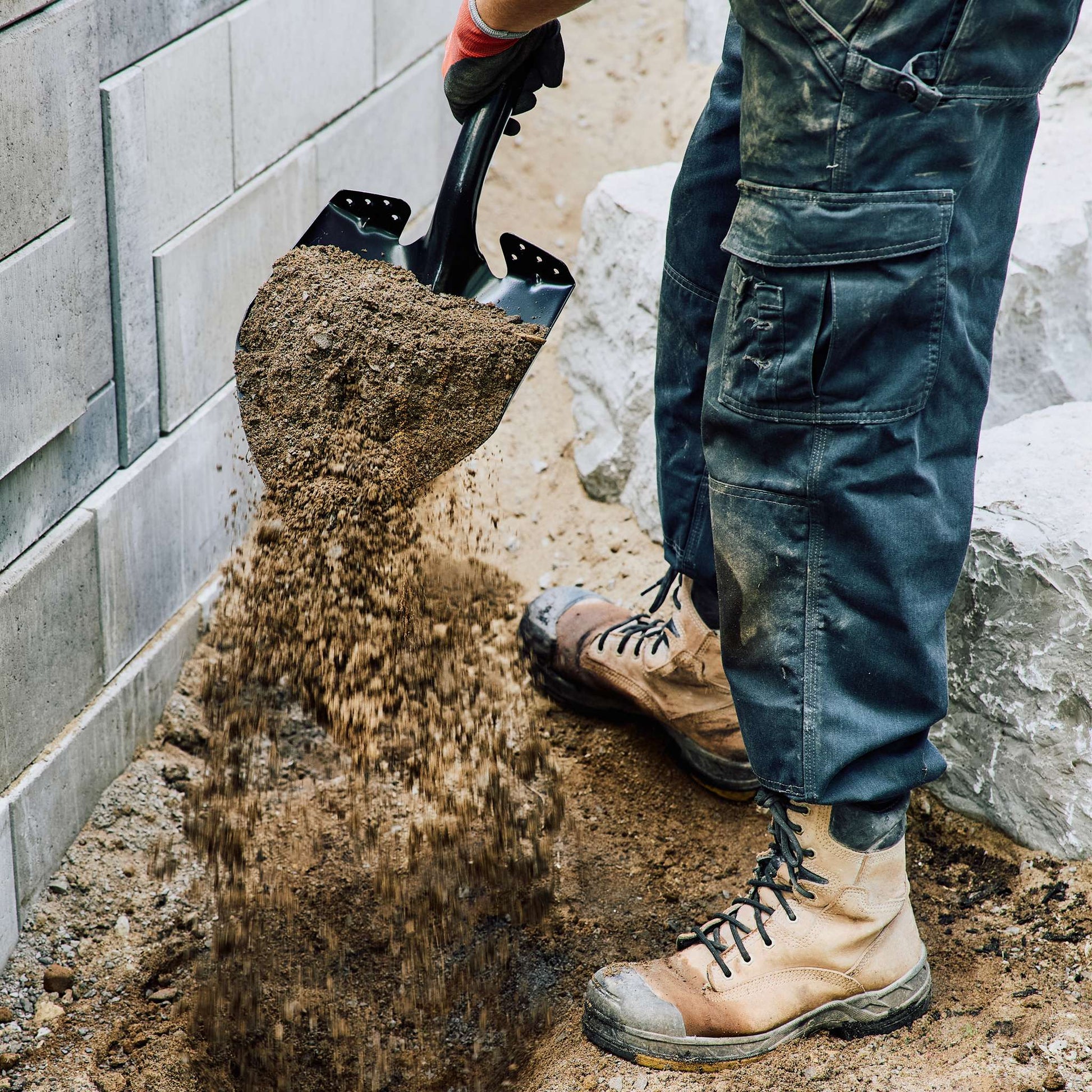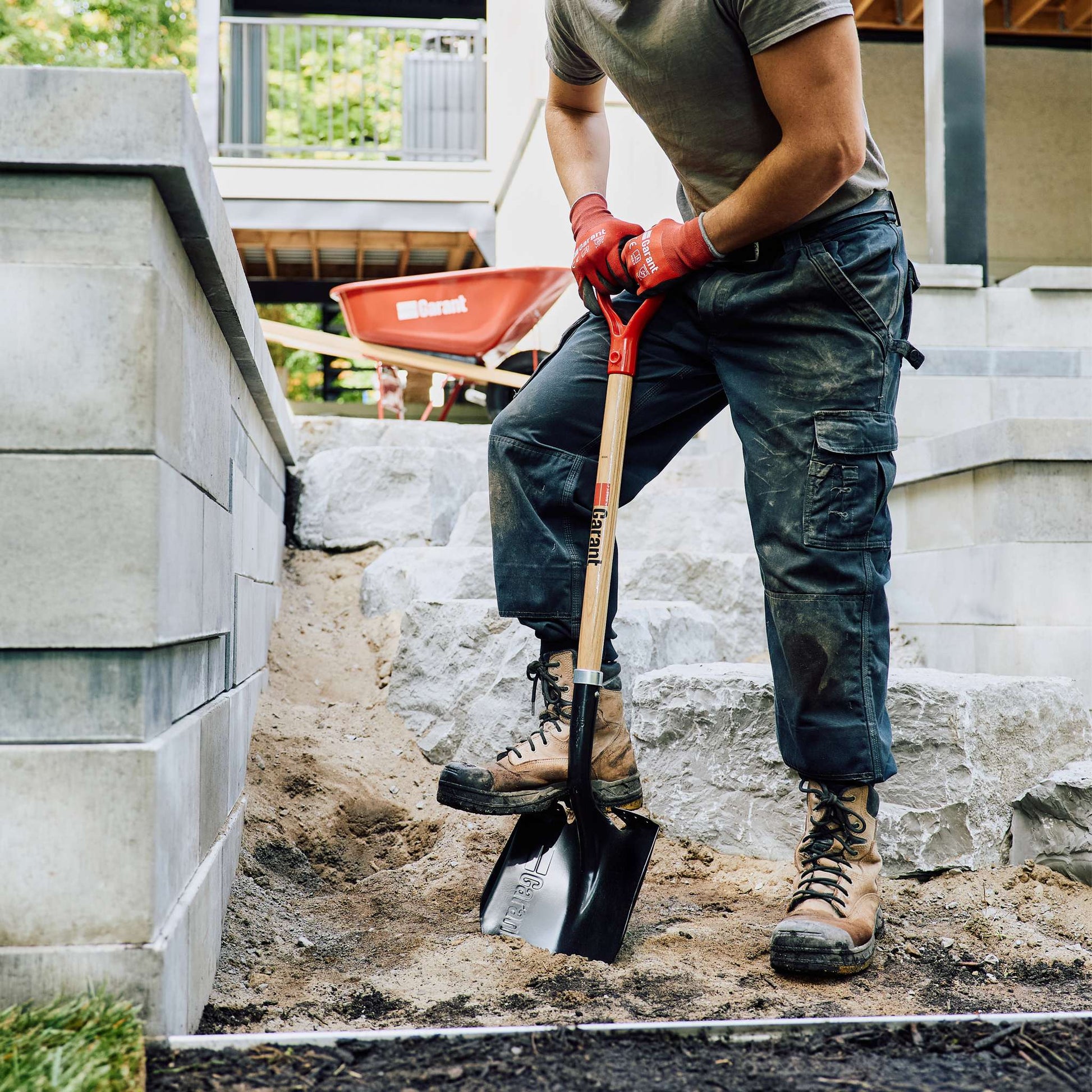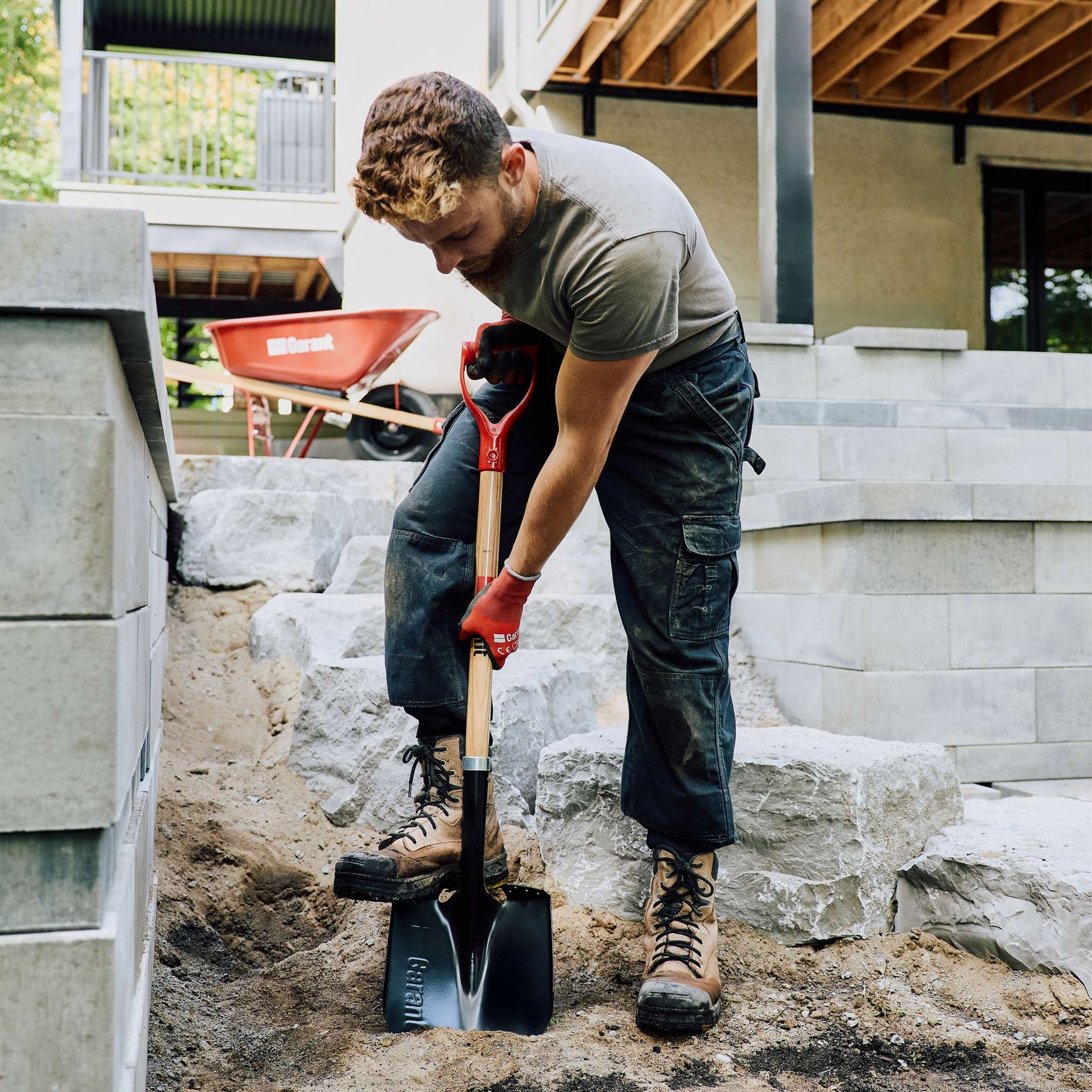 The arrow shaped blade of this Garant excavator shovel penetrates the soil much more easily than a regular round point blade.