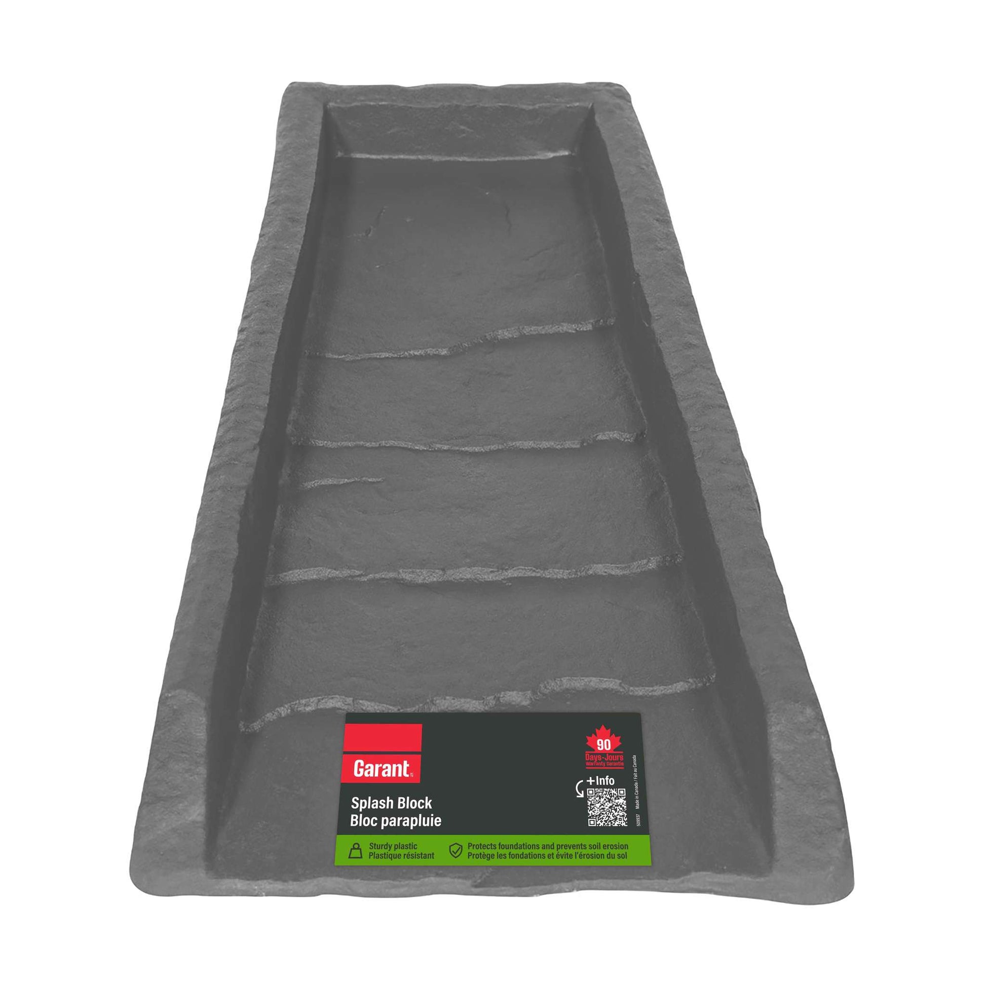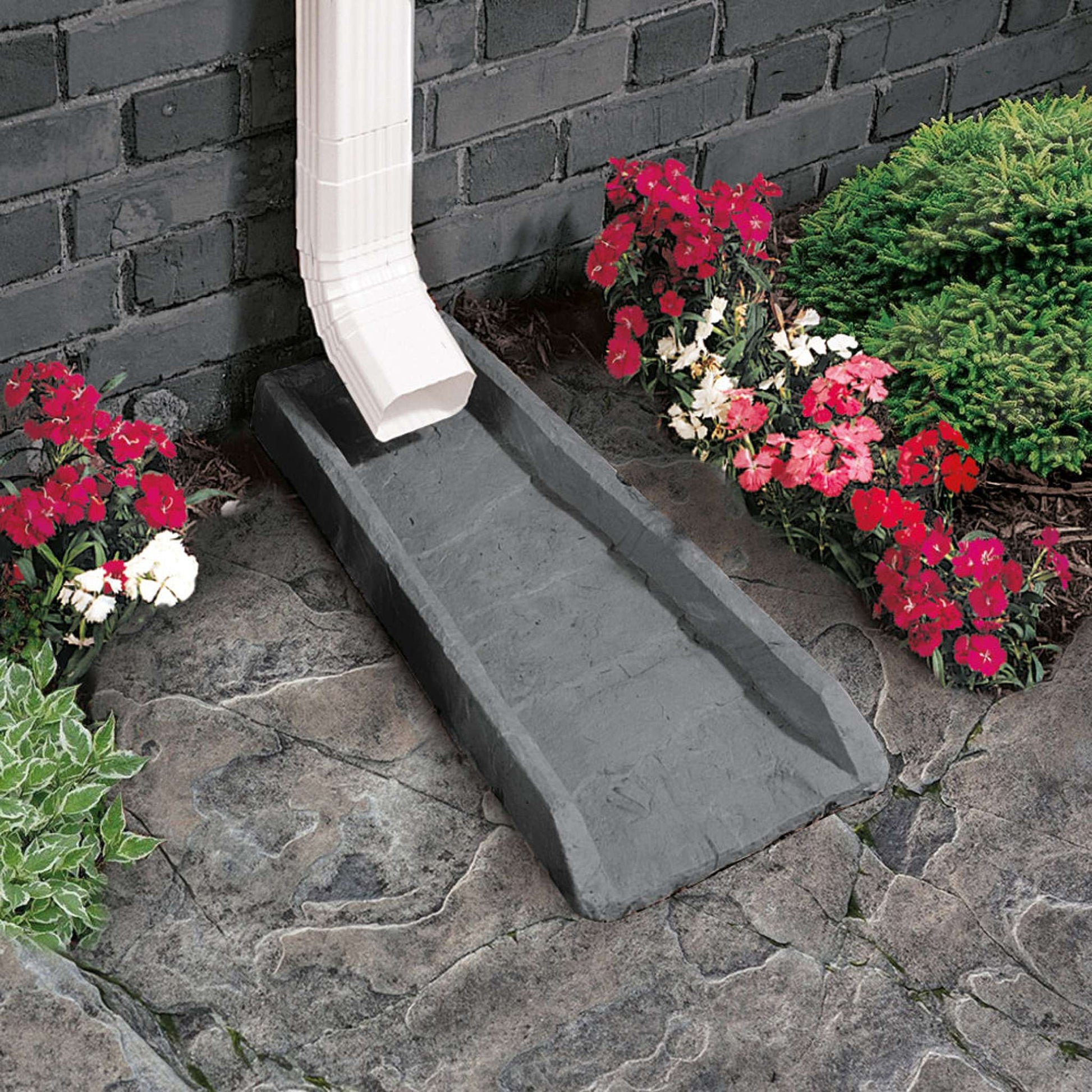The splash block will prevent soil erosion and foundation damages caused by water runoff. Its stone-like texture will blend in seamlessly with your home. Made of rugged poly composite, it won’t chip or crack like concrete and will keep its natural slate appearance for years.