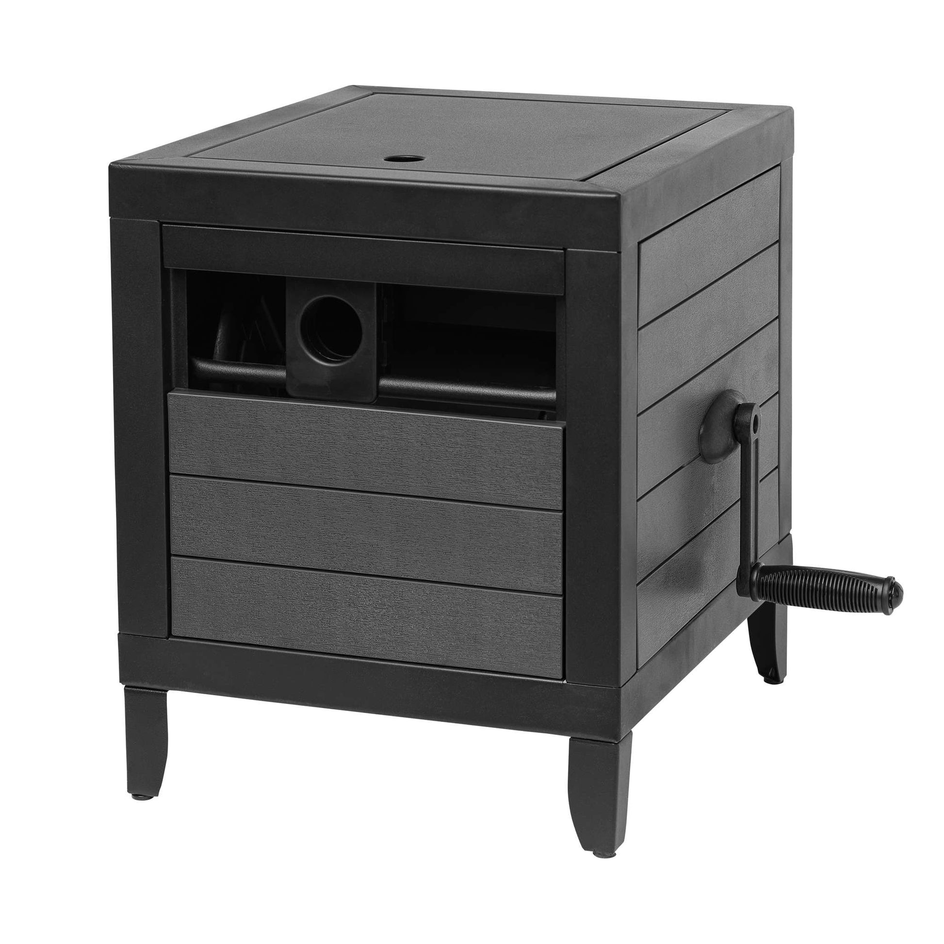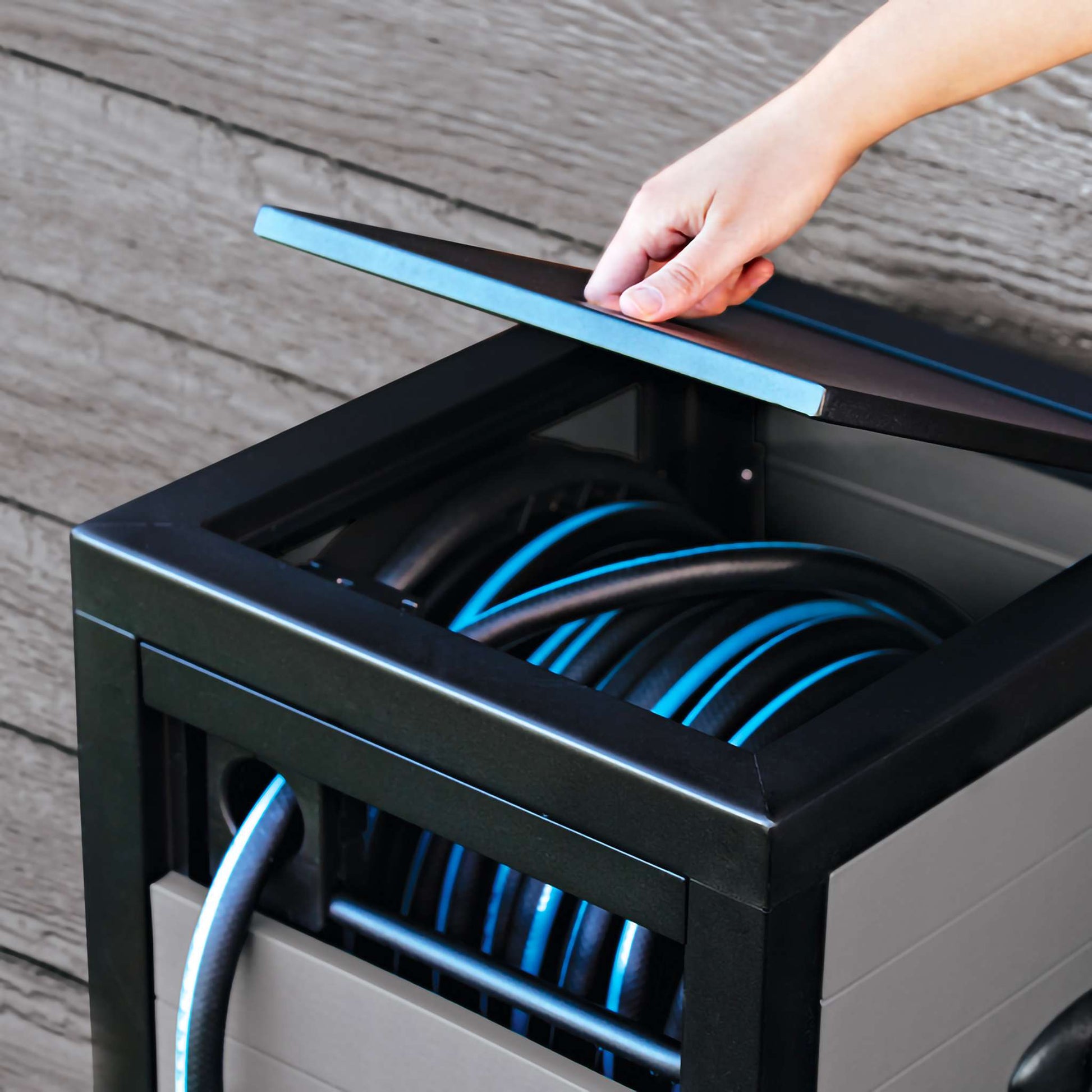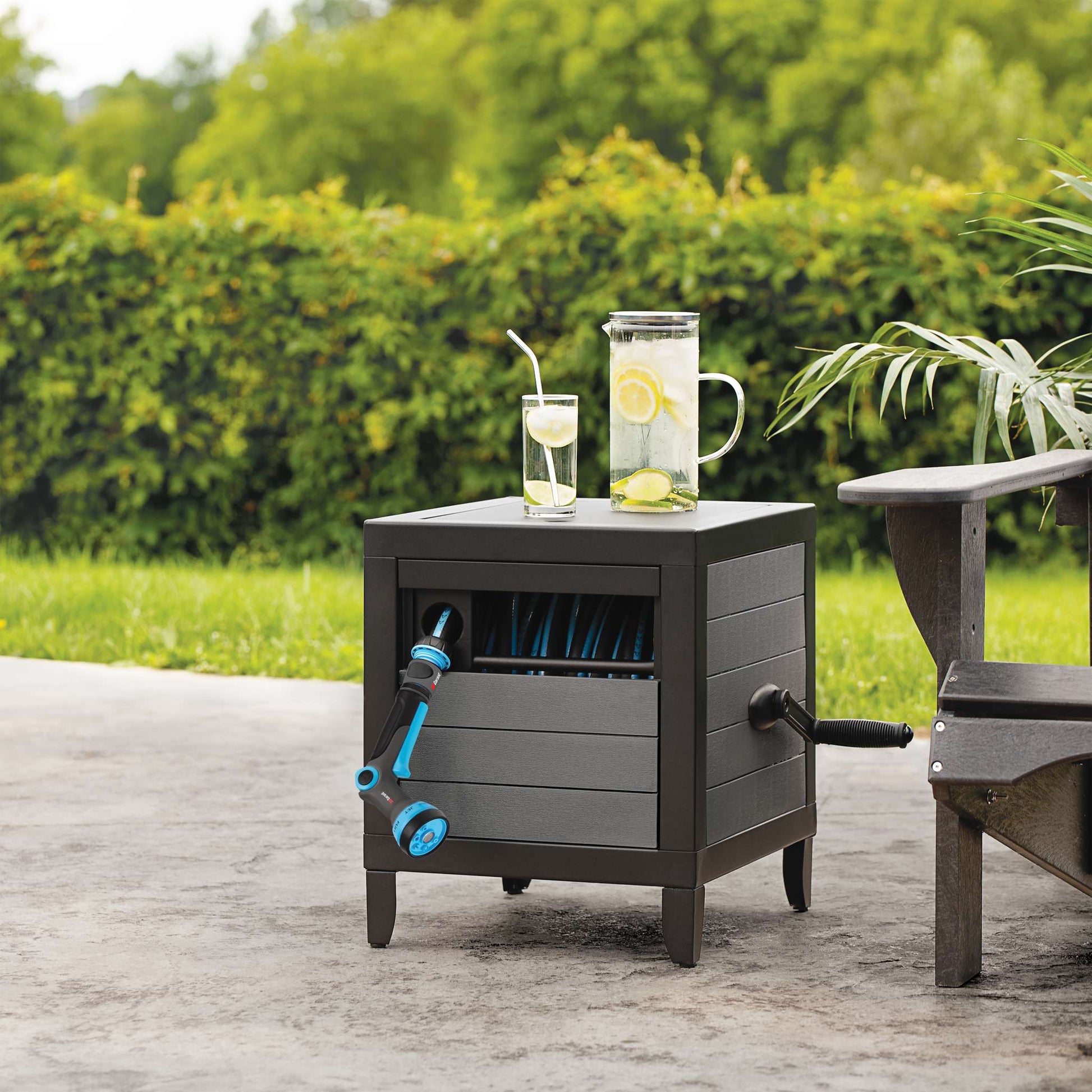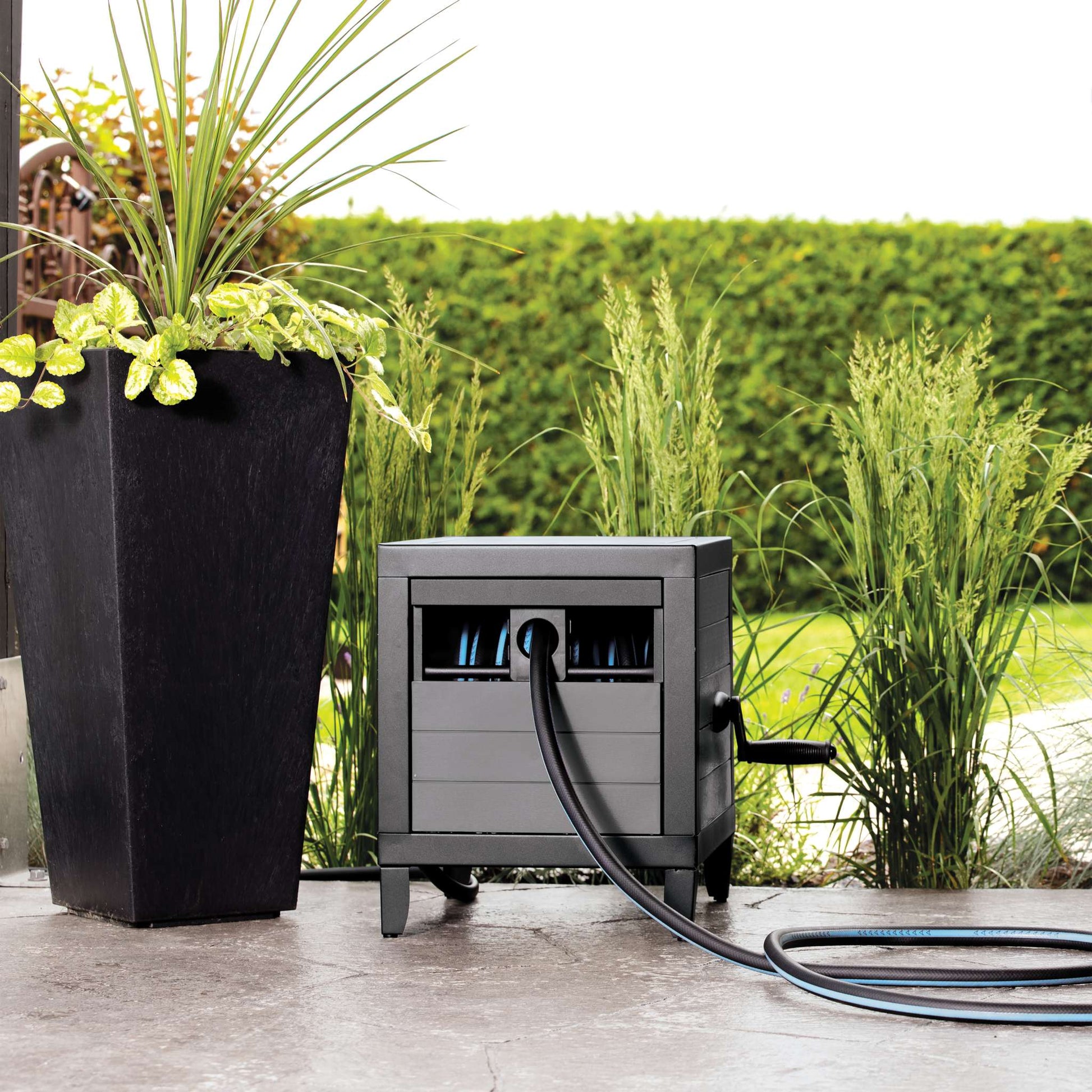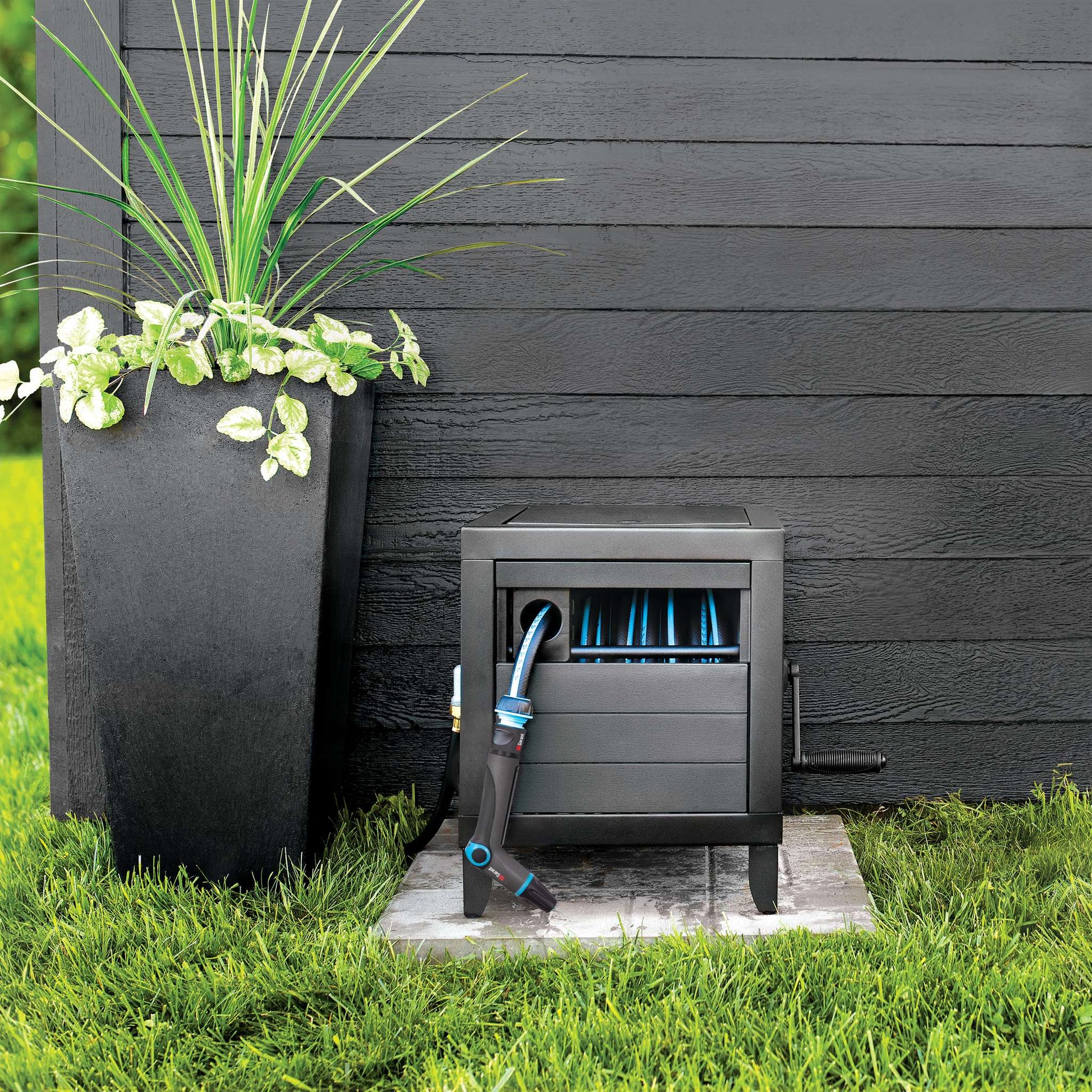 Le meuble dévidoir de Garant permet d’enrouler un boyau de 30 mètres (100 pi). Aussi esthétique que pratique, il est construit sur un cadre de métal robuste, pour une stabilité et une durabilité maximales. Ses panneaux latéraux, en plastique résistant gris, présentent un fini effet bois conçu pour s’intégrer à votre décor extérieur avec élégance. Le système de guide de boyau AUTO-TRACK assure un enroulement sans faille alors que son système en aluminium évite les fuites. Ce joli meuble dévidoir Garant nécessite un minimum d’assemblage. Garant facilite vos travaux d’arrosage !