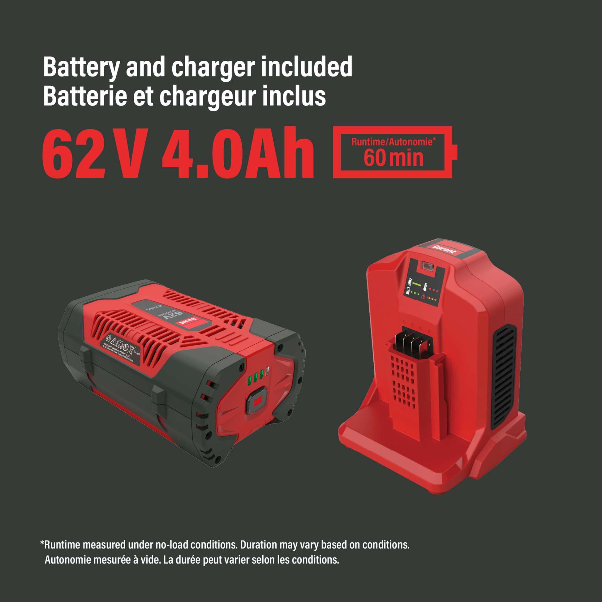 - Comprend une batterie 62V 4,0 Ah et un chargeur pour une autonomie prolongée et une disponibilité immédiate dès les premières chutes de neige.