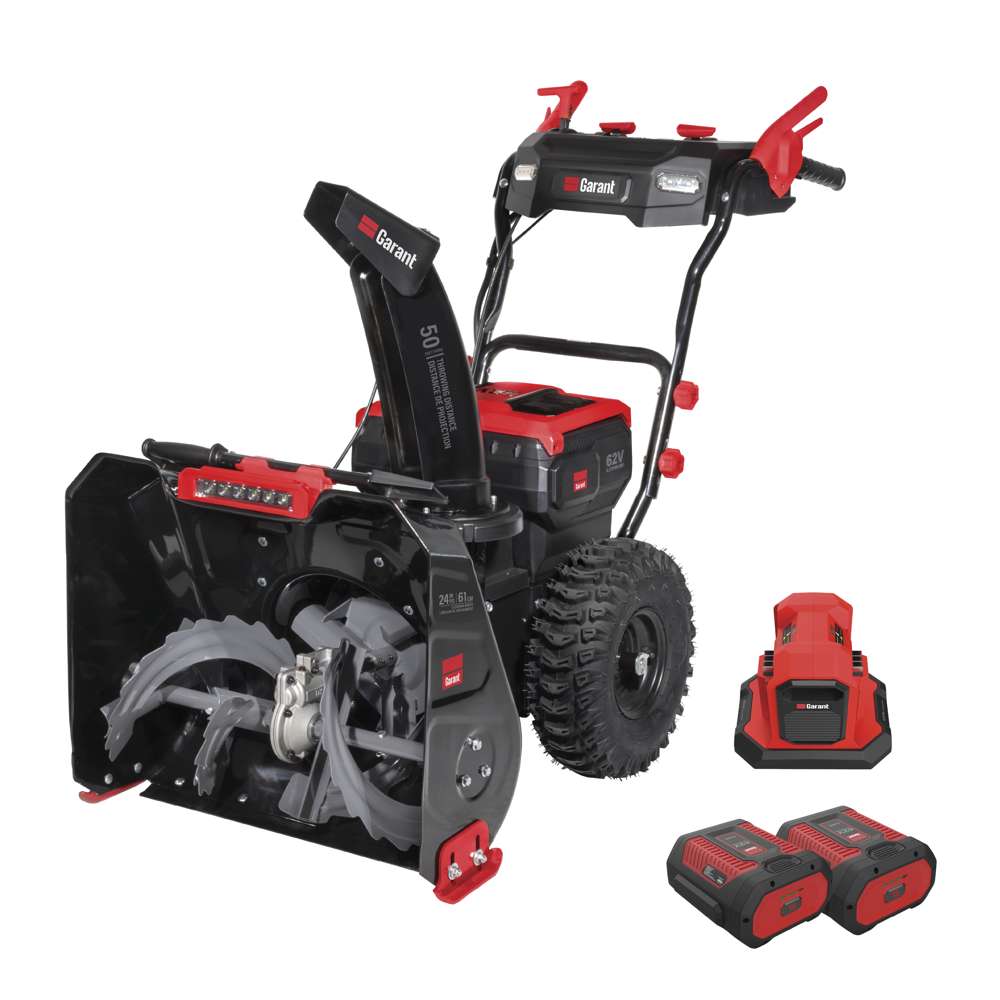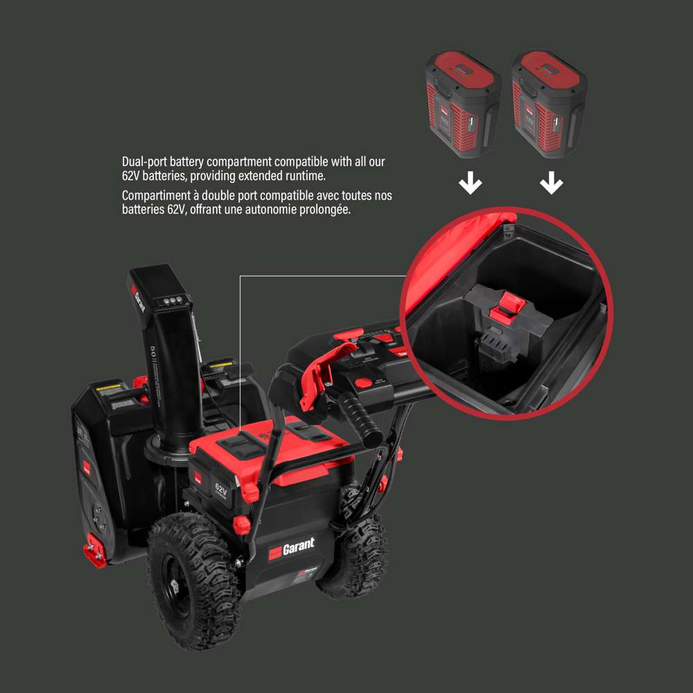 - Déneigement puissant: Moteur sans balais, traction autopropulsée et système à deux phases pour affronter la neige compacte. Deux batteries 62V 8,0 Ah et chargeur double inclus pour jusqu’à 60 minutes d’autonomie, même en conditions exigeantes.