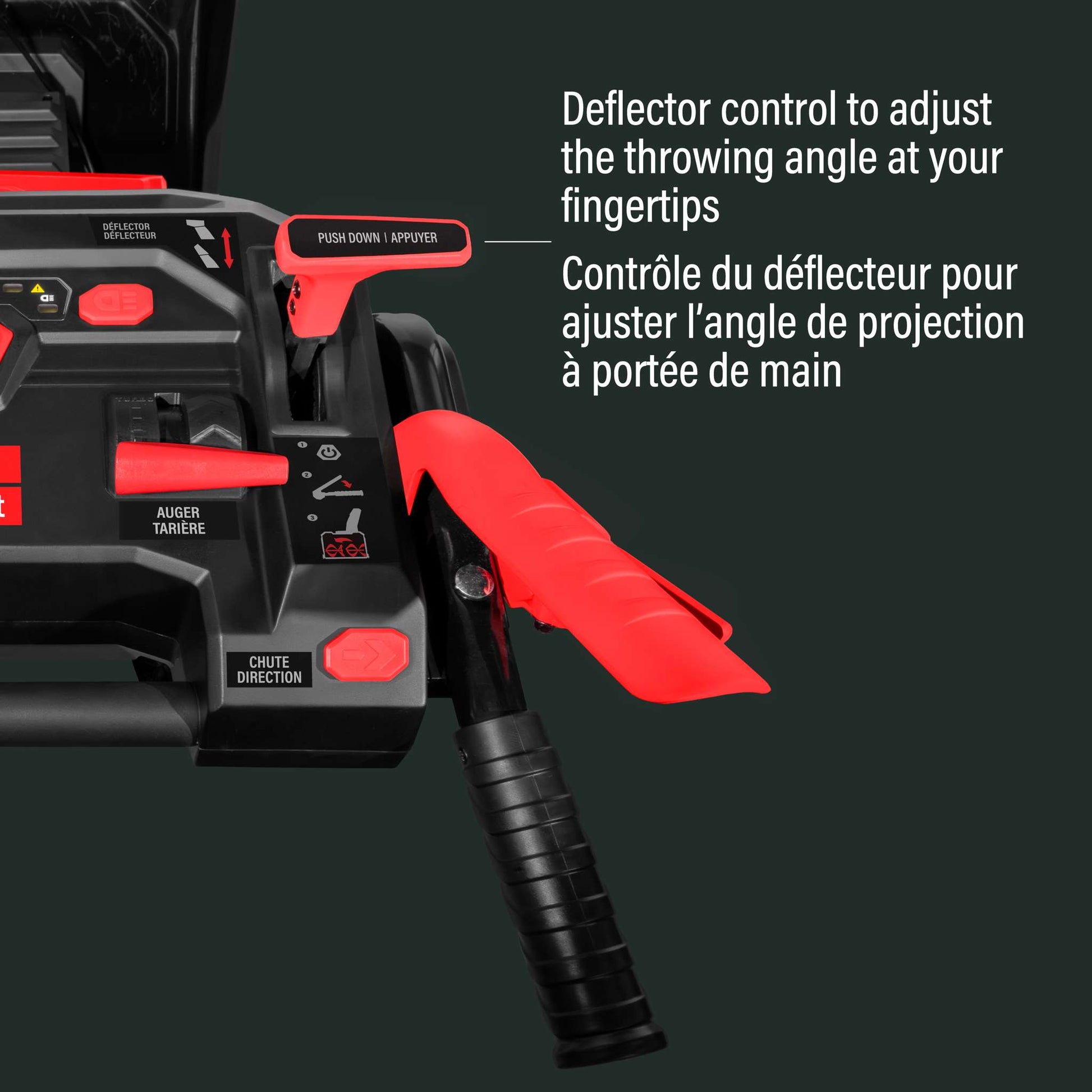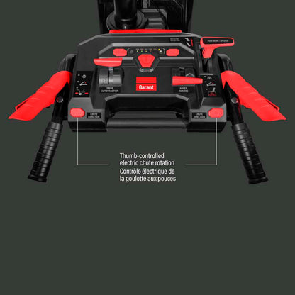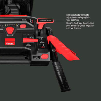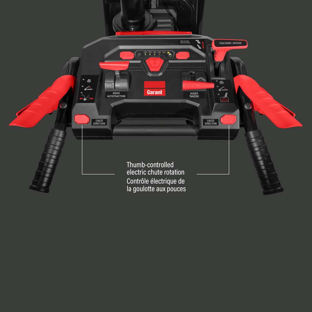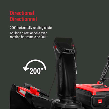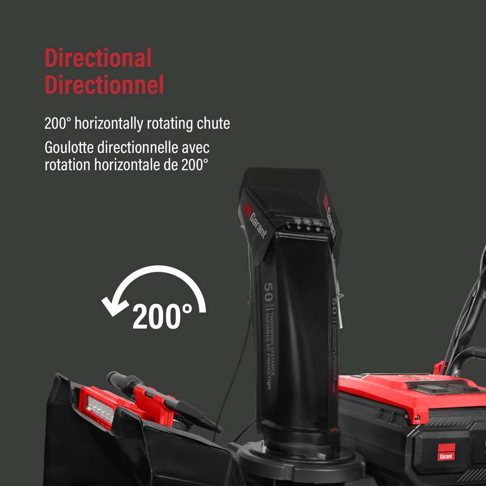 - Contrôle précis de la projection : Goulotte rotative à 200° commandée au pouce et levier pour ajuster l’angle vertical. Projette la neige jusqu’à 15 m (50 pi) avec précision.