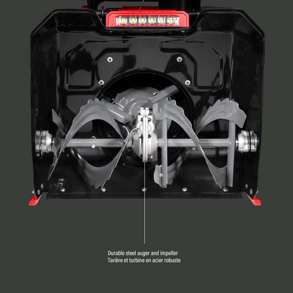 - Construction robuste : Tarière en acier de 10 po, turbine en acier de 12 po et patins en acier ajustables pour s’attaquer aux fortes accumulations sur différents types de surfaces.