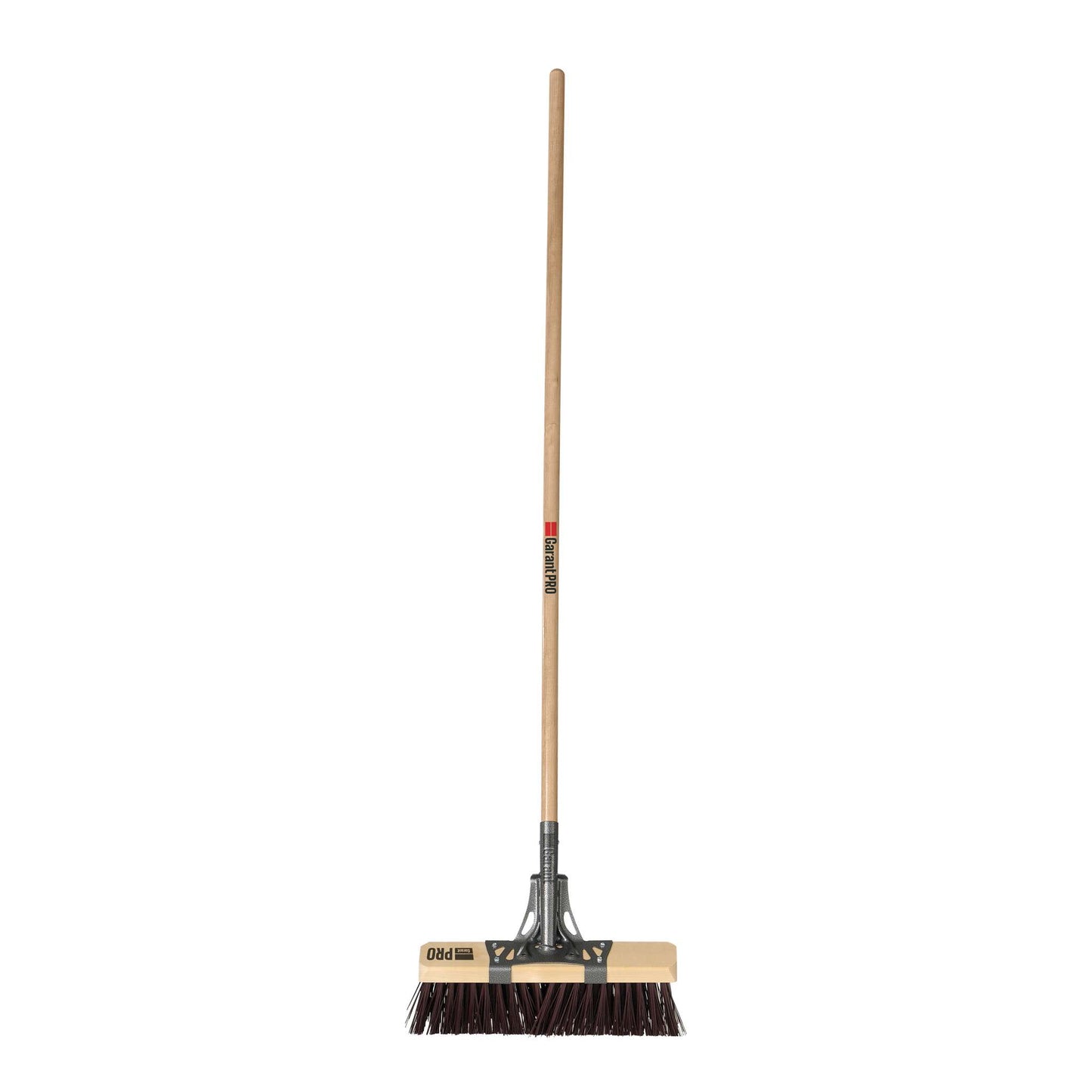 Balai de rue/d'étable de qualité industrielle pour surfaces extra-rugueuses. Brosse de fibres synthétiques d'une largeur de 16 po. Attachement d'acier trempé et soudé pour plus de robustesse. Manche en bois dur verni de première qualité (1-1/8po x 60po). Parfait pour le balayage de gros débris. Garantie à vie limitée.